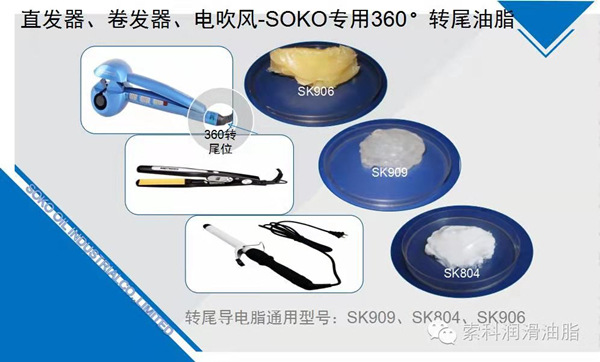 索科SOKO轉(zhuǎn)尾油脂專為直發(fā)器/卷發(fā)器360度無(wú)死角長(zhǎng)效應(yīng)用,有效減少磨損,對(duì)塑膠及貴金屬無(wú)化學(xué)反應(yīng),索科SOKO專用轉(zhuǎn)尾油脂SK909 和SK908系列/電源線轉(zhuǎn)動(dòng)部位接點(diǎn)潤(rùn)滑油廣泛應(yīng)用于各大國(guó)際知名品牌廠的直發(fā)器、自動(dòng)卷發(fā)神器中。