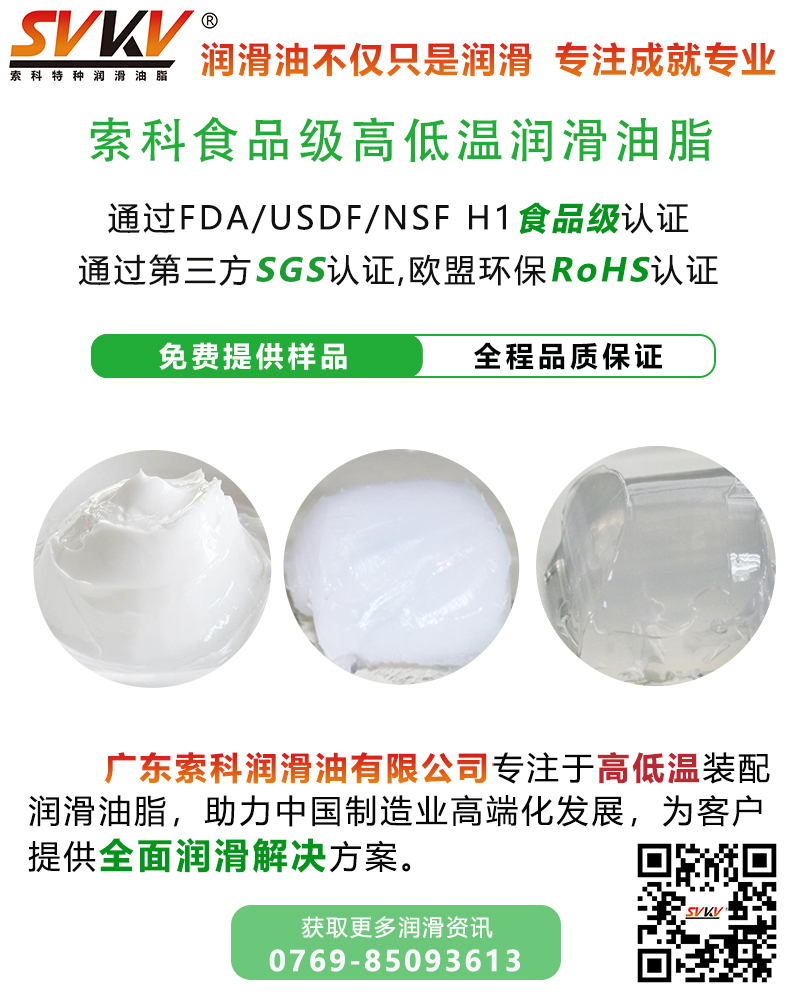 SVKV索科食品級全合成高低溫消音潤滑油脂選用食品級的基礎油和無毒無害的添加劑精制而成,專為食品加工和醫療設備而研制。SVKV索科食品級全合成高低溫靜音潤滑脂符合美國FDA和USDA法規和標準,并通過美國USDA/NSF H-1食品級認證,保障烤箱食品安全健康。