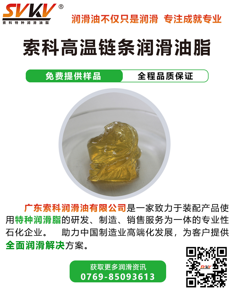 SVKV索科高溫鏈條油脂是以優質基礎油、添加抗氧、抗磨、防銹等添加劑調制而成。索科高溫鏈條油可承受極高溫,不易洗掉和燒毀受保護涂層,對金屬零件具有極好的防腐蝕、防磨損、防水、防銹等特性,在高溫下抗氧化不冒煙、不積碳、防止金屬燒結卡死的消音和長效潤滑作用。