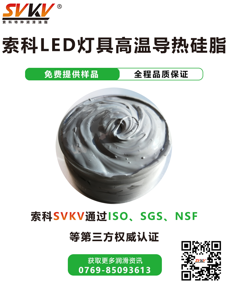 索科SVKV LED燈具高溫導熱硅脂以聚硅氧烷為基礎輔以高導熱填料精制而成,安全環保,性能穩定,既具有優異的電絕緣性,又具有優異的導熱性,揮發性小,可薄膜涂覆。