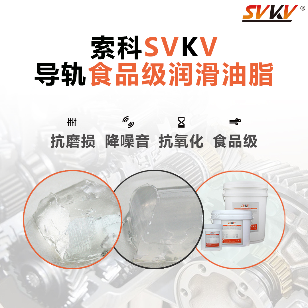 索科SVKV665系列導軌食品級潤滑油脂選用食品級的基礎油和無毒無害的添加劑精制而成,專為食品加工及醫療設備而研制。食品級降噪音潤滑油脂針對苛刻的工作環境(高/低溫、高轉速、高扭力)能有效的降低噪音,減少機械產品的磨損、延長其壽命并降低維護頻率。食品級降噪音潤滑油脂符合FDA和USDA的法規和標準,并通過USDA/NSF H-1食品極認證,保障食品安全,確保整條生產線滿足食品級潤滑要求。