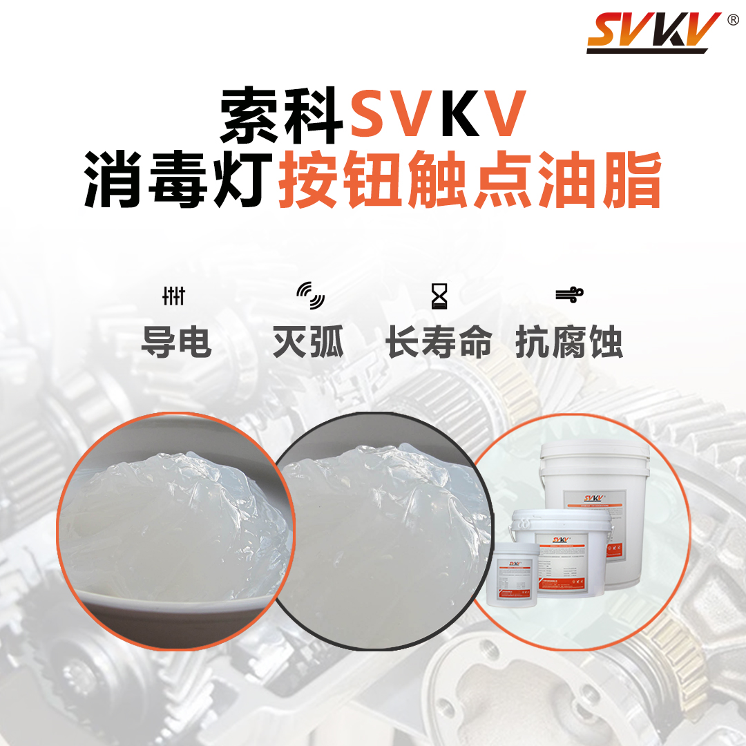 索科SVKV906系列消毒燈按鈕觸點油脂由無機皂稠化非矽酮類合成油加超導電添加劑?抗氧化劑等精煉而成。SK系列開關觸點油脂專為電子電器的旋轉和滑動開關的防電弧?抗氧化?抗磨損和保護而設計,能有效降低接觸電阻和溫升,防止積碳的產生。